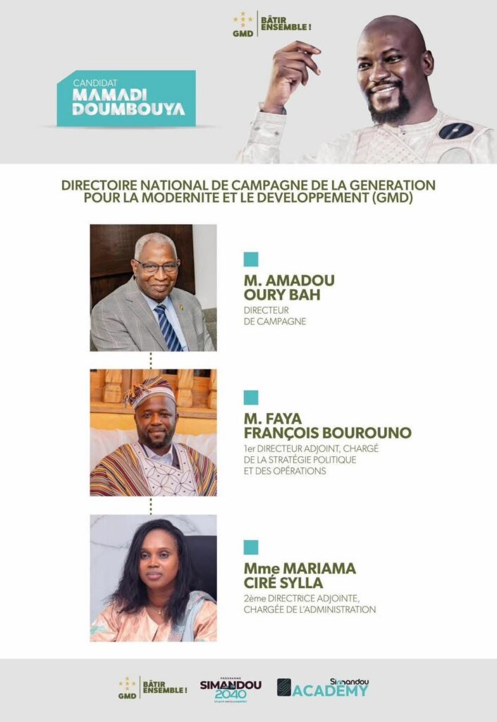 La direction de la campagne de la Génération pour la Modernité et le Développement (GMD) sera pilotée par le Premier ministre Amadou Oury Bah, nommé Directeur national de campagne. Il sera assisté de Faya François Bourouno, ministre de la Fonction publique, désigné premier Directeur adjoint en charge de la stratégie politique et des opérations, et de Mariama Ciré Sylla, ministre de l’Agriculture, deuxième Directrice adjointe chargée de l’administration.