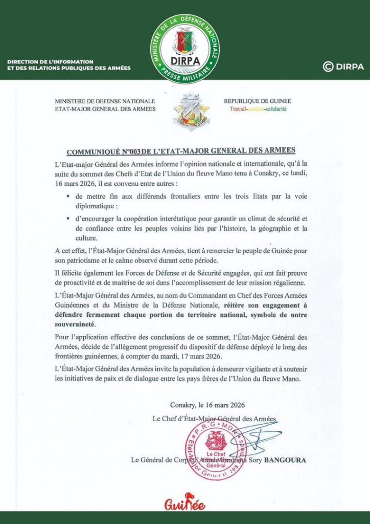 Réaffirmant son engagement à « défendre fermement chaque portion du territoire national », l’État-major a néanmoins appelé les citoyens à rester vigilants et à soutenir les efforts de paix et de dialogue engagés entre les pays membres de l’Union du fleuve Mano.