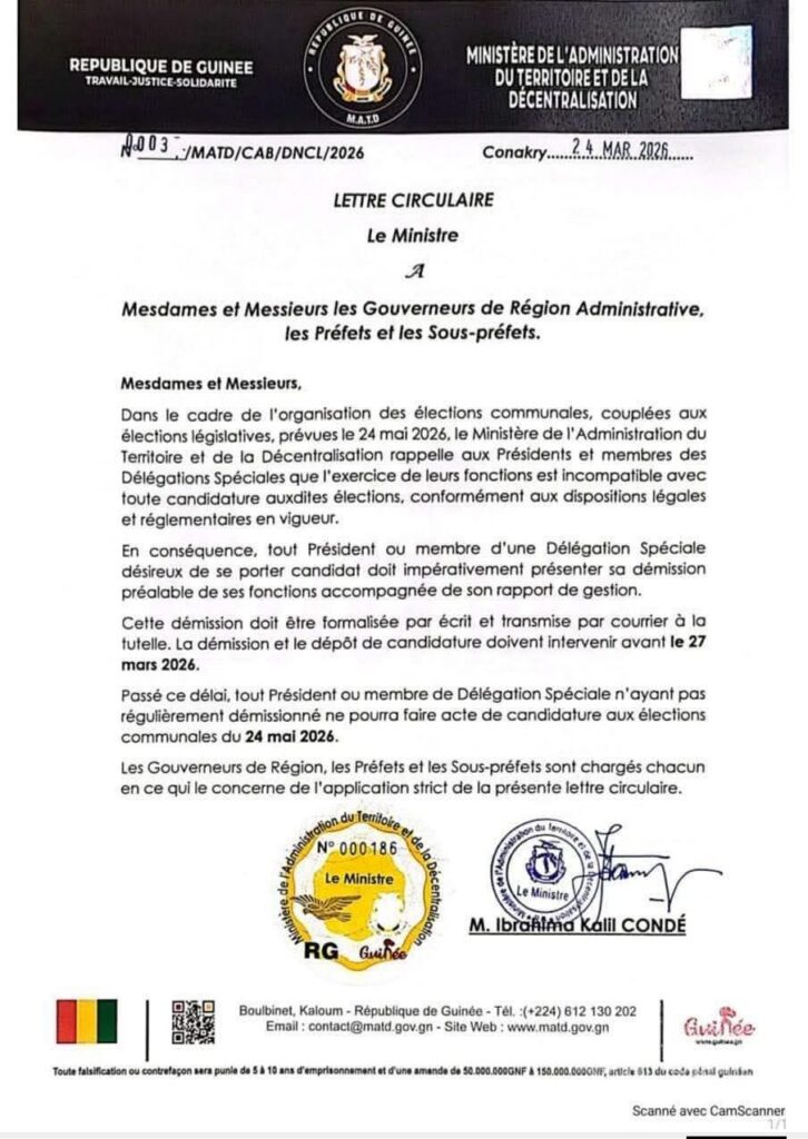 Passé ce délai, aucune tolérance ne sera accordée. « Tout Président ou membre de Délégation Spéciale n’ayant pas régulièrement démissionné ne pourra faire acte de candidature aux élections communales du 24 mai 2026 », avertit le Ministre Ibrahima Kalil Condé dans la lettre circulaire.