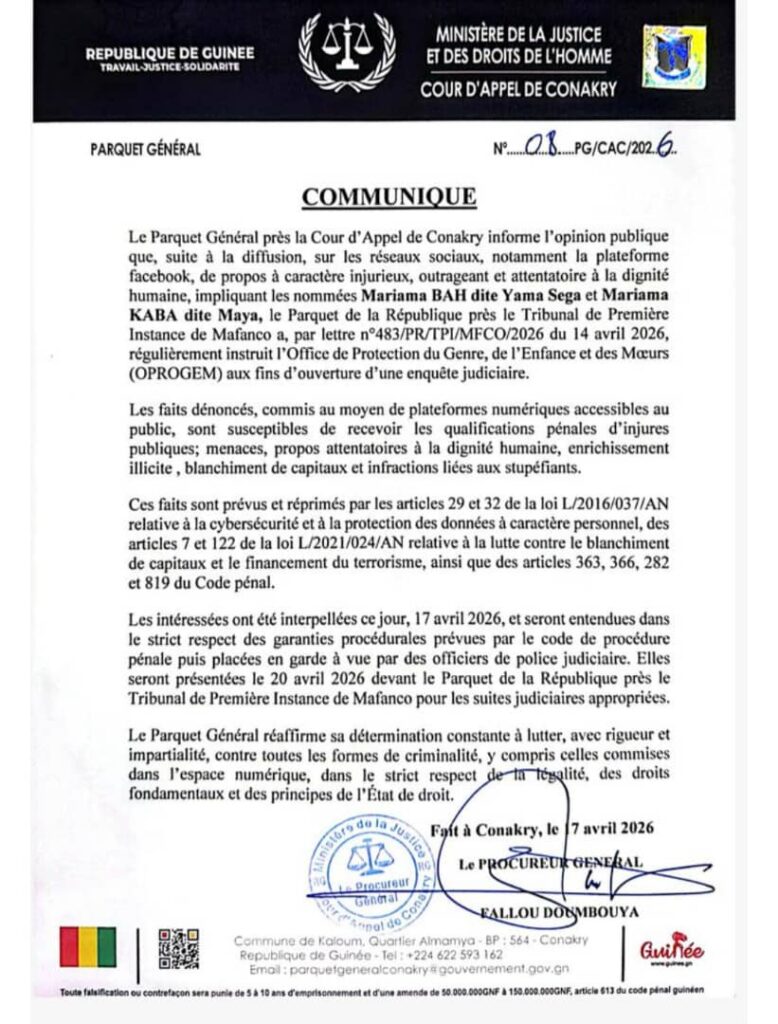 Conakry – Le parquet général près la cour d’appel de Conakry a annoncé l’ouverture d’une enquête contre Yama Sega et Maya la Solution. Elles sont accusées d’avoir tenu des propos injurieux et pour des faits liés à la criminalité financière et aux stupéfiants. L’affaire fait suite à la diffusion de contenus sur les réseaux sociaux.